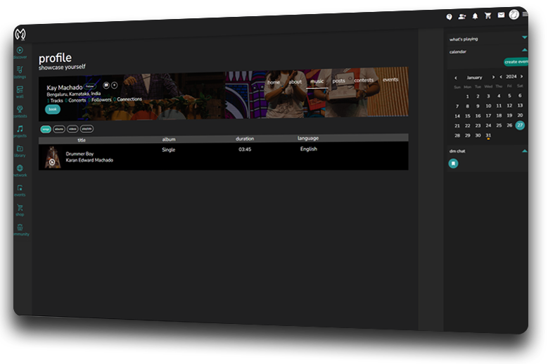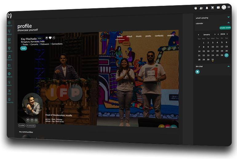 Your profile isn't just a page; it's your comprehensive all-in-one microsite. Think of it as your personal headquarters on the internet, a one-stop shop for everything related to your music. Show off your upcoming events, consolidate your tracks effortlessly, monitor your performance data, and establish a striking online presence that's easy to share and network. With musifie's intuitive tools, managing your online presence becomes a breeze, freeing you up to focus on what you do best - creating music.